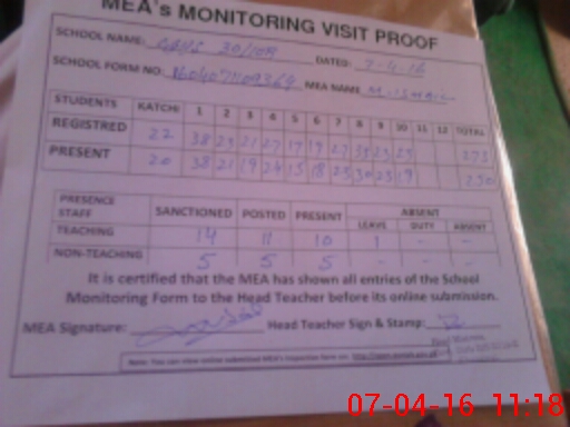 | Attendance Register | Head Teacher | MEA with School | Visit Proof |
