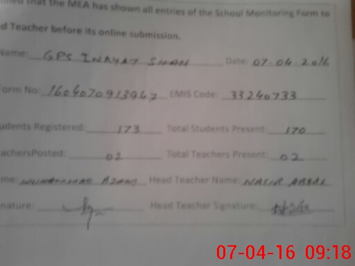 | EMIS Code: 33240733 | Name of School: GPS INAYAT SHAH | |||