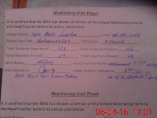 | School Visited by School Health & Nutrition Supervisor (No. of Visits) | 1 | Name1: | Zara Batooll | Name2: | Nil |