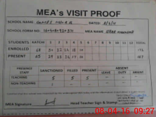 | Attendance Register | Head Teacher | MEA with School | Visit Proof |