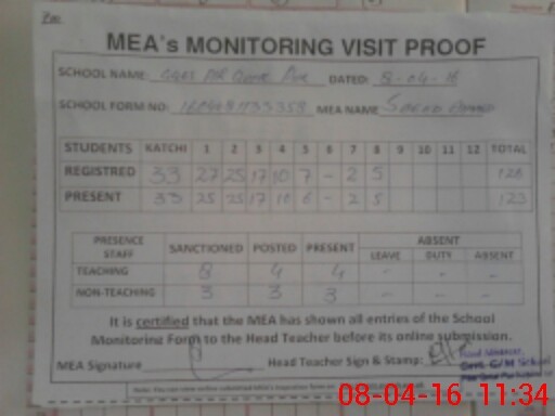 | Attendance Register | Head Teacher | MEA with School | Visit Proof |