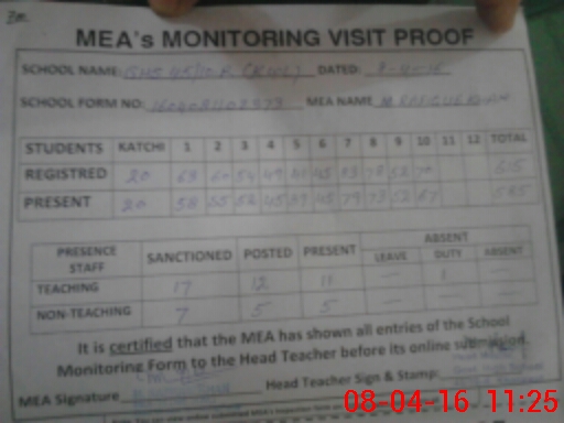 | Attendance Register | Head Teacher | MEA with School | Visit Proof |