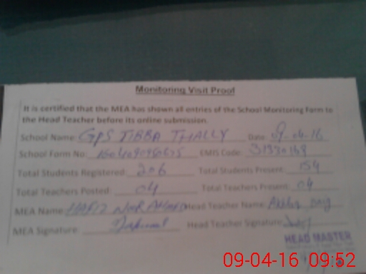 | Attendance Register | Head Teacher | MEA with School | Visit Proof |