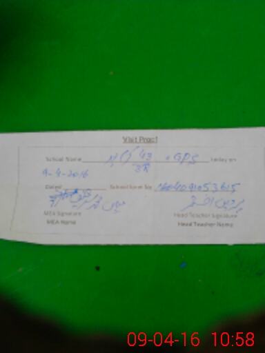 | School Visited by School Health & Nutrition Supervisor (No. of Visits) | 1 | Name1: | Masood Rehman | Name2: | |