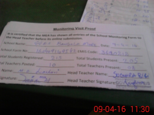 | Remarks (Use Separate Page if Required): SUPPLEMENTARY READING MATERIAL IIS IN USE NAZIM SHAH OF GGCMS SANDHI WALA A QAYYUM OF GGES ASHIQPUR LASOORI ADIL SHAHZAD OF GGES RASOOL PUR CLASS IV ARE ATTACHED TEMPORERLY WITH THIS SCHOOL | |||||