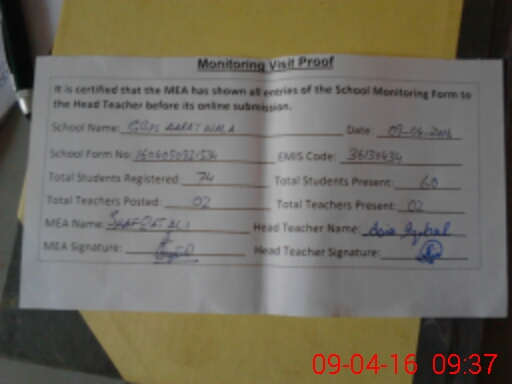 | EMIS Code: 36130434 | Name of School: GGPS AARAY WALA MUZA JHOK LASHAKAR PUR | |||