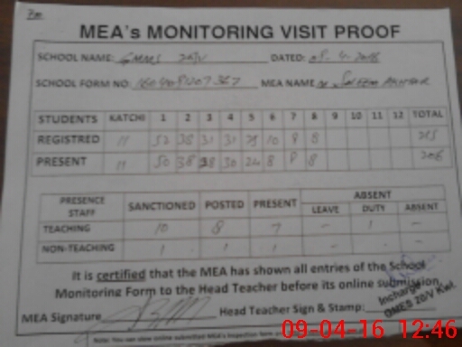 | Attendance Register | Head Teacher | MEA with School | Visit Proof |