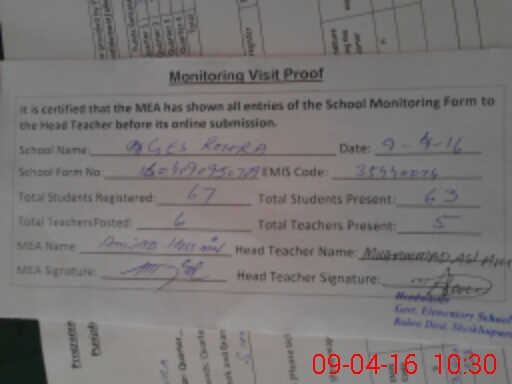 | Attendance Register | Head Teacher | MEA with School | Visit Proof |