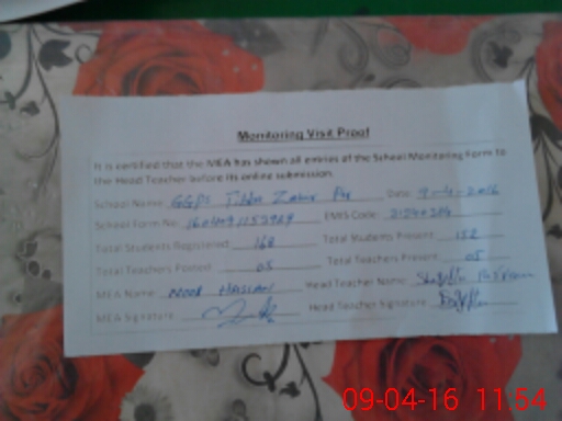 | Attendance Register | Head Teacher | MEA with School | Visit Proof |