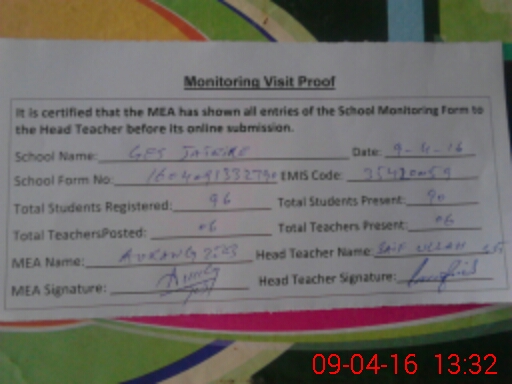 | Attendance Register | Head Teacher | MEA with School | Visit Proof |