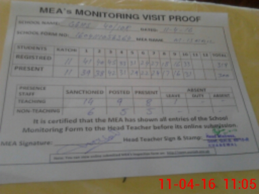 | Attendance Register | Head Teacher | MEA with School | Visit Proof |