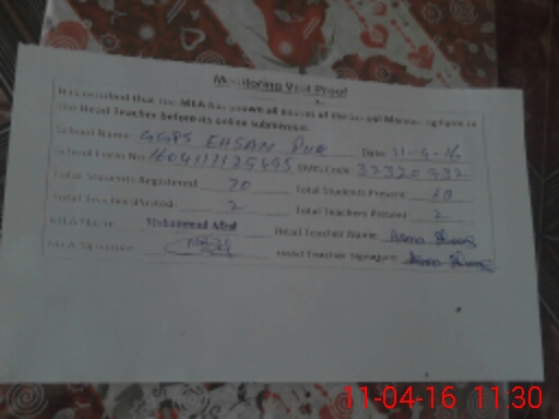 | Attendance Register | Head Teacher | MEA with School | Visit Proof |