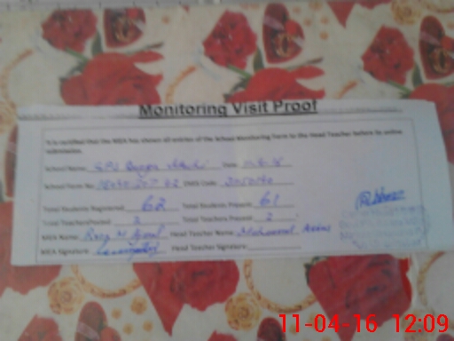 | Attendance Register | Head Teacher | MEA with School | Visit Proof |