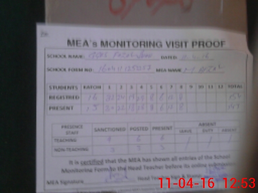 | Attendance Register | Head Teacher | MEA with School | Visit Proof |