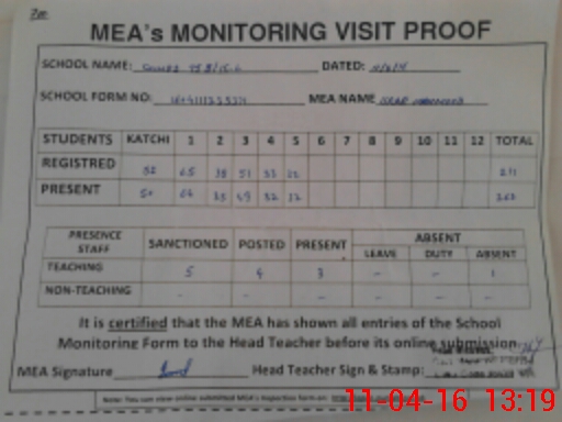 | Attendance Register | Head Teacher | MEA with School | Visit Proof |