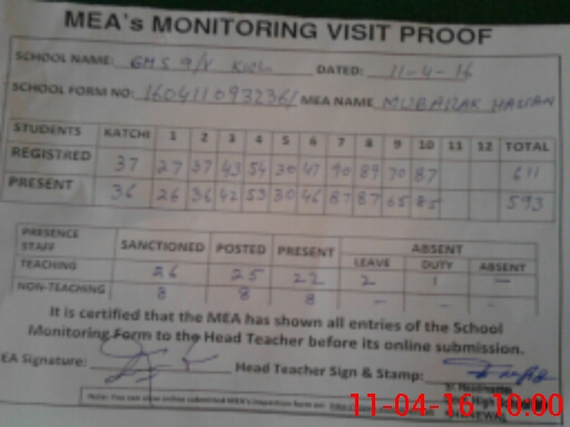 | Attendance Register | Head Teacher | MEA with School | Visit Proof |