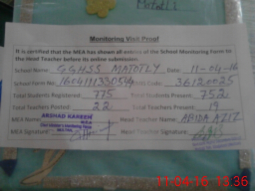 | EMIS Code: 36120025 | Name of School: GGHSS MATOTLY SHUJABAD | |||
