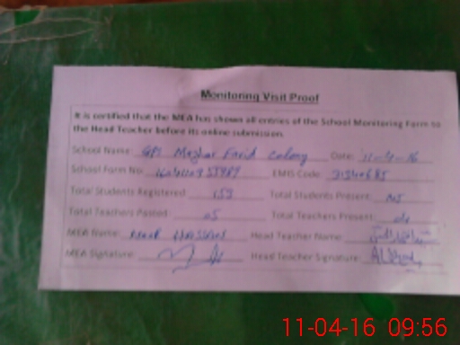 | EMIS Code: 31340685 | Name of School: GPS MAZHAR FARID COLONY | |||