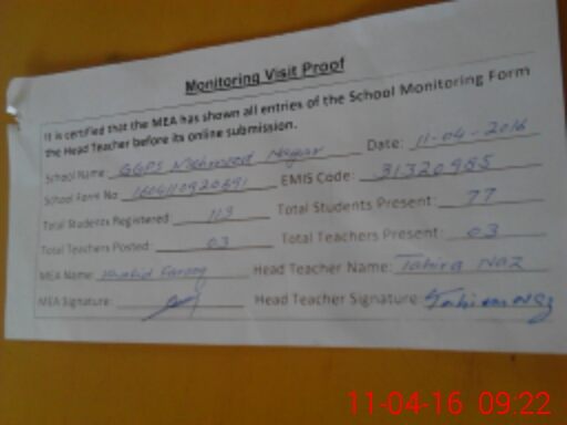 | Attendance Register | Head Teacher | MEA with School | Visit Proof |