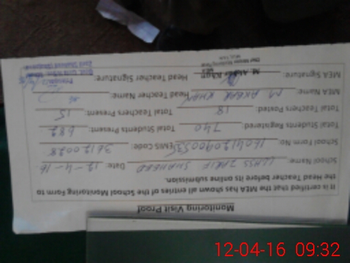 | Attendance Register | Head Teacher | MEA with School | Visit Proof |