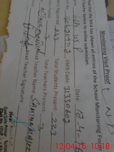 | EMIS Code: 31330602 | Name of School: GGPS CHAK NO. 105/P | |||