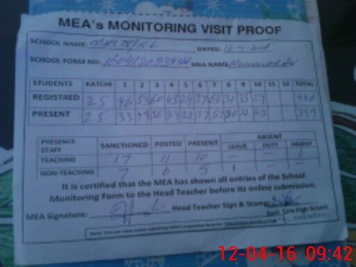 | Attendance Register | Head Teacher | MEA with School | Visit Proof |