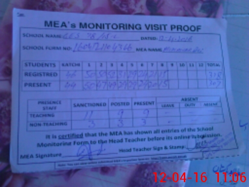 | Attendance Register | Head Teacher | MEA with School | Visit Proof |