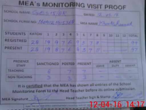 | Attendance Register | Head Teacher | MEA with School | Visit Proof |