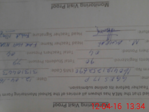 | Attendance Register | Head Teacher | MEA with School | Visit Proof |