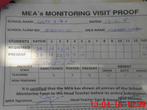 | Attendance Register | Head Teacher | MEA with School | Visit Proof |