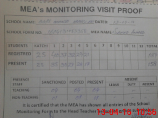 | Attendance Register | Head Teacher | MEA with School | Visit Proof |