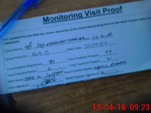 | Attendance Register | Head Teacher | MEA with School | Visit Proof |