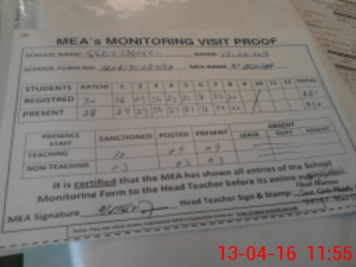 | Attendance Register | Head Teacher | MEA with School | Visit Proof |