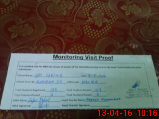 | Attendance Register | Head Teacher | MEA with School | Visit Proof |