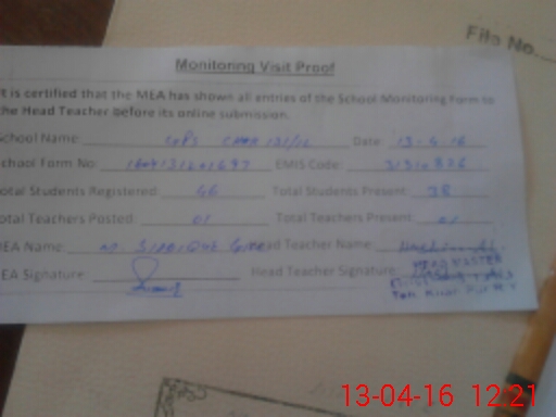 | Attendance Register | Head Teacher | MEA with School | Visit Proof |