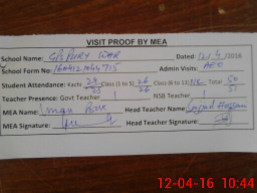 | School Visited by School Health & Nutrition Supervisor (No. of Visits) | 1 | Name1: | Karim Nawaz | Name2: | Nil |