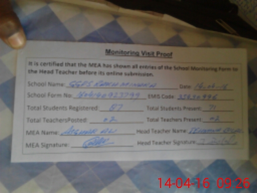 | Attendance Register | Head Teacher | MEA with School | Visit Proof |