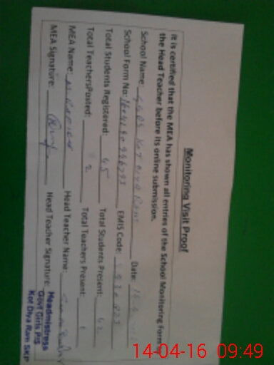 | Attendance Register | Head Teacher | MEA with School | Visit Proof |