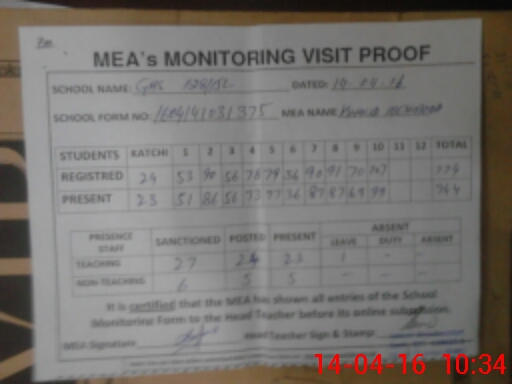 | Attendance Register | Head Teacher | MEA with School | Visit Proof |