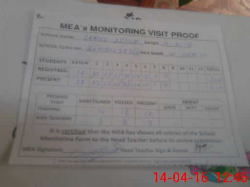 | Attendance Register | Head Teacher | MEA with School | Visit Proof |