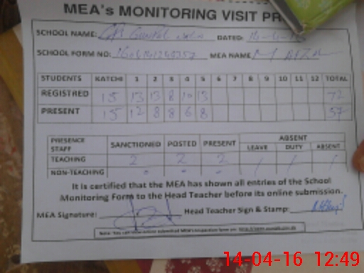 | Attendance Register | Head Teacher | MEA with School | Visit Proof |