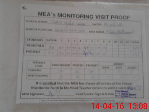 | Attendance Register | Head Teacher | MEA with School | Visit Proof |