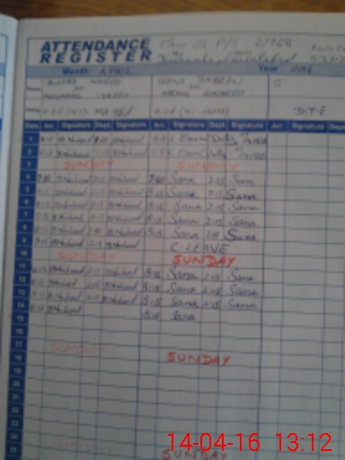 | CNIC | Full Name | Designation | R/C | Absence During Last Calender Month |