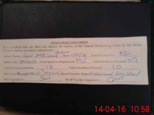 | Attendance Register | Head Teacher | MEA with School | Visit Proof |