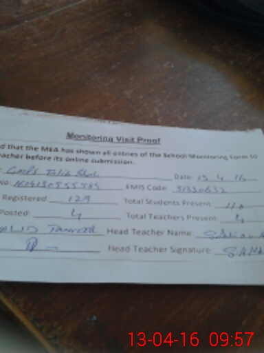 | Attendance Register | Head Teacher | MEA with School | Visit Proof |