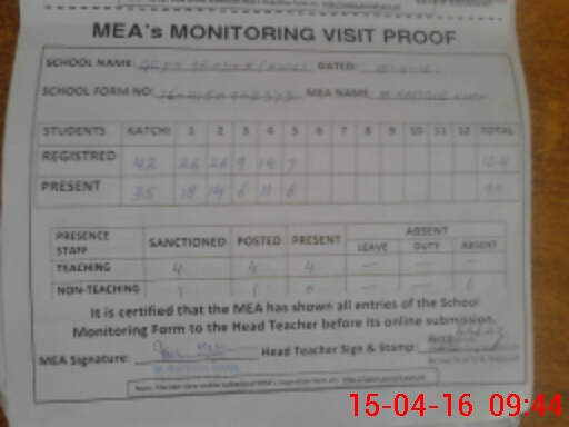 | Attendance Register | Head Teacher | MEA with School | Visit Proof |