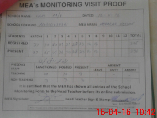 | Attendance Register | Head Teacher | MEA with School | Visit Proof |