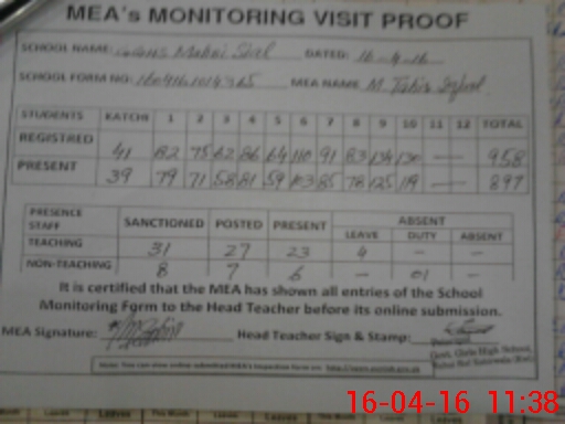 | Attendance Register | Head Teacher | MEA with School | Visit Proof |