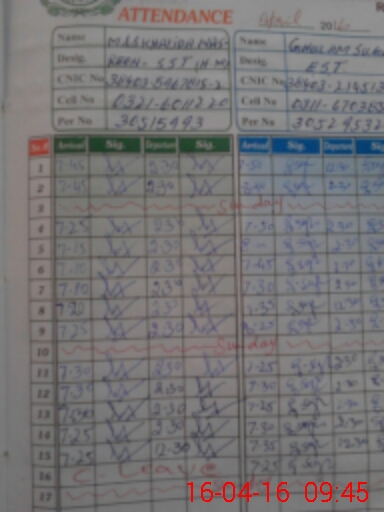 | CNIC | Full Name | Designation | R/C | Absence During Last Calender Month |
