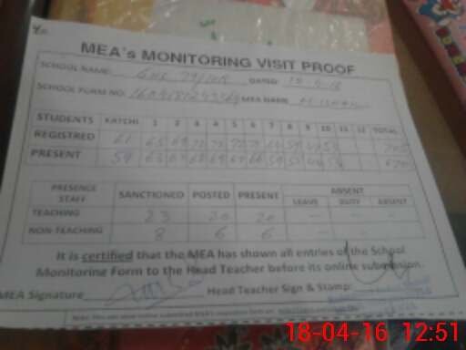 | Attendance Register | Head Teacher | MEA with School | Visit Proof |